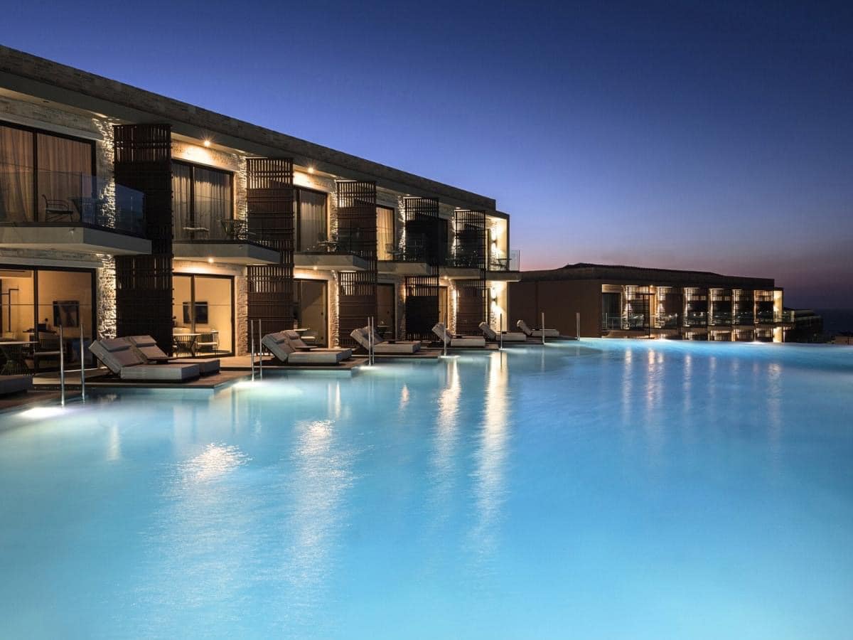 The hotel offers a luxury all inclusive experience with stunning Ionian Sea views, lagoon-style infinity pools, overwater rooms, and boho-style décor, making it an enchanting adults-only retreat.
